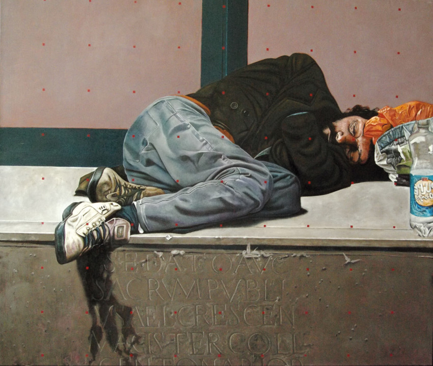 Az alvó egy hajléktalant ábrázol, aki egy olyan emelvényen fekszik, amelyen latin felirat olvasható. Mintha egy római isten talapzatára helyezte volna a kitaszítottat, aki az elesettségében is ember.