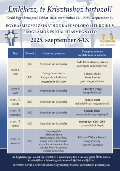 Szeptember 13-án, szombaton, a győri székesegyház felszentelésének ünnepén búcsúszerzésre van lehetőség a 10 órakor kezdődő ünnepi szentmisén, amelynek főcelebránsa Michael Wallace Banach érsek, magyarországi apostoli nuncius lesz. Ezen a szentmisén csendül fel először az erre az alkalomra írt zsinati mise, a tatai kapucinus templom ifjúsági ének- és zenekarának közreműködésével.