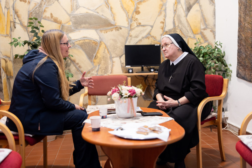 Miközben beszélgetünk, az aktív ápoló Teréz nővér és a lelki támogatás terén tevékenykedő, nyugdíjas Erika nővér sietnek el mellettünk – azaz sietnének, de az igazgató megállítja őket. Látszik, hogy ezer dolguk van, mégis kedvesen üdvözölnek minket. Szent József ünnepe van, a hamarosan kezdődő szentmisére készülnek, Varga Zoltán piarista atyát várják. Teréz nővér továbbigyekszik, de Erika nővér kicsit leül közénk beszélgetni.