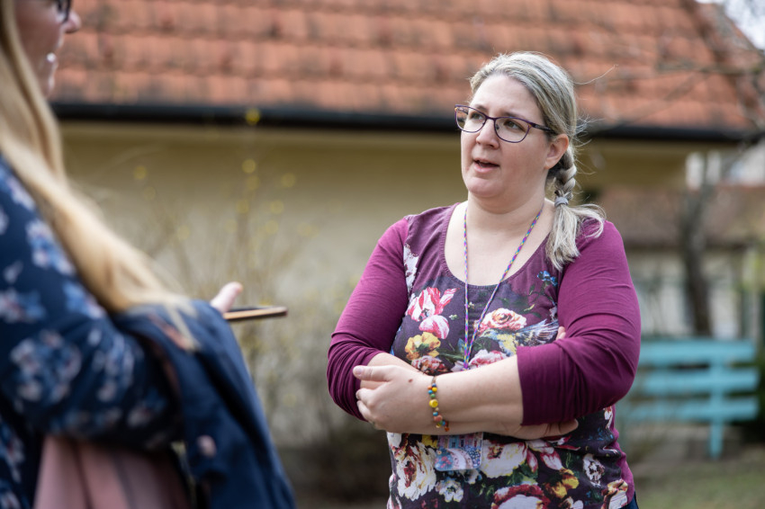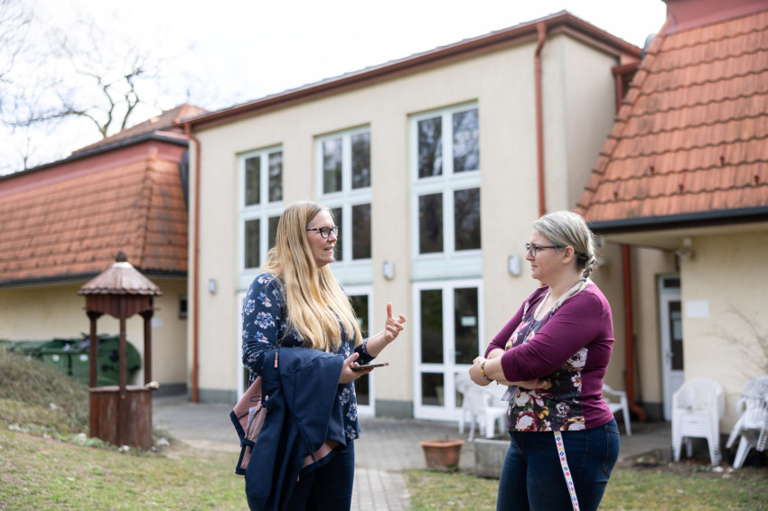Körülöttünk zajlik az élet: egy család előgondozásra érkezett; jönnek-mennek a lakók, akik érdeklődve figyelnek, mindenki kedvesen biccent; a munkatársak közül is többen megállnak egy kávéra. Nem maradnak el a mosolyok. Otthonos érzés.
