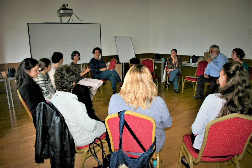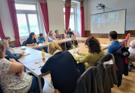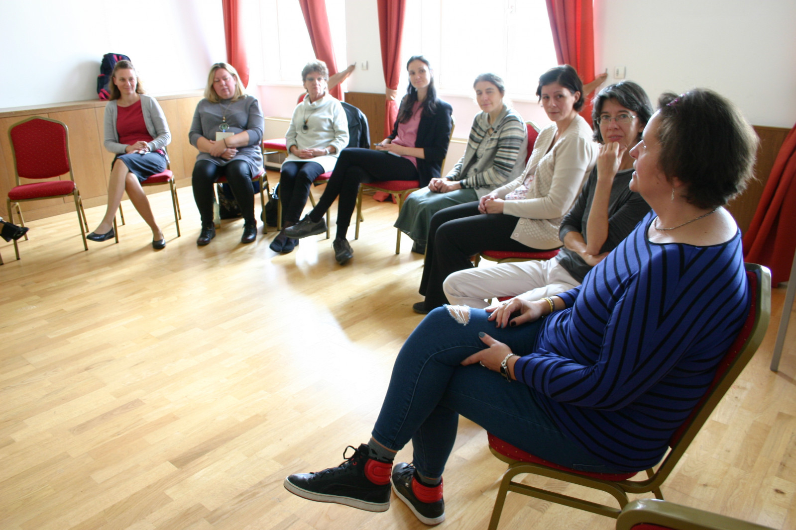 A délelőtt folyamán a résztvevők megismerkedtek a reflektív team szupervíziós módszerrel. Sólyom Bea – aki a Ferences Kilátó vezetője – volt ebben segítségünkre. Beával azt beszéltük meg, hogy nem előadást tart, hanem műhelymunka formájában azonnal kipróbáljuk, és a gyakorlatban ismerjük meg a módszert. Már a csoporton belüli ismerkedés is játékos formában történt, ezzel is gazdagítva a résztvevők ötlettárát, hiszen ezeket az intézményi munkájuk során tudják hasznosítani.