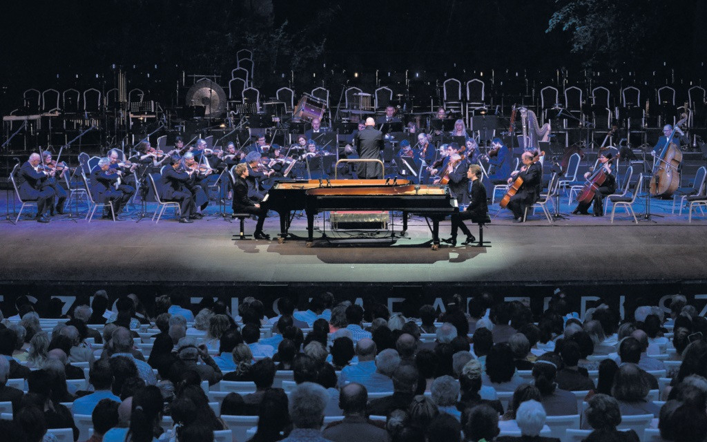 Nem hiszem, hogy megfontolt szerepjátszók lennének; úgy tűnik, a testvéri köteléken és az általuk művelt zene szeretetén túl a lelki rokonság is hozzájárul Lucas és Arthur rokonszenves művészi szimbiózisához. Persze óhatatlanul van valami kimódolt az ilyen közös pódiumi szereplésben. Ahogy öltözködésük „ikres” összehangolása, úgy eltérő egyéniségük ugyancsak külső jegyekkel történő tükröztetése is a kialakított imázs része lett. A divatosan belőtt séró Lucas esetében afféle eltökélt sportemberre, irányító focistára, Arthurnál lobogó, lánglelkű művészre „hajaz”. Szinte lámpaláz nélkül, vagy azt jól leplezve, természetes mosollyal lépnek színpadra, kedélyes gesztusokkal kommunikálva egymással és a karmesterrel. A zenekari bevezető alatt a zongora mellől még egy gyors terepszemle, felmérő körbepillantás a szélesen elterülő nézőtérre, aztán marad a zene: a már ki tudja, hányszor megszólaltatott Mozart-opus. A fivérek láthatóan élvezik ezt a huszonöt perces, könnyed művet, a közös játékot, de komolyan veszik. Nem rutinból zenélnek, az egymásra koncentráló, jelző biccentések, a nehezebb belépéseknél a dirigens intéseinek figyelmes, bizalomról árulkodó követése tökéletes összpontosításra utal. Nem gondolnánk, hogy efféle „kamarazenélés” működhet a szabadtéren, de a hozzáállás és a hangzás minősége eloszlatja a kétségeket. Meglepetés, hogy e fesztiválközönség avatott koncertlátogatókból áll, senki sem tapsol bele a versenyműbe. Az Andante sajátos próba elé állítja a szólistákat, mert a távolból, talán a pesti oldalon horgonyzó hajóról vagy egy Duna-parti szórakozóhelyről áthallik a „duc-duc”. A legrosszabbkor előtolakodó zajhulladék minden tekintetben e lassúbb, bensőséges tétel ellentéte. A Jussen testvérek azonban profik, nem jönnek zavarba, nem zökkenti ki őket a beszüremlő idegenség. Látszólag tudomást sem vesznek a pódiumon túli külvilágról, az újraéledt Budapest más régióiból érkező hangokról, az itt kialakuló stílus- és ritmuskavalkádról. A Rondó felszabadult örömzenélése után a „jelenbe” visszatérve, ismét két trendi ifjú művész hajlong a színpadon külön-külön és bajtársiasan összekapaszkodva. Lelkesen, lezserül, olykor cinkossággal egymásra mutogatva, ahogyan a lemezborítókhoz, interjúkhoz és reklámanyagokhoz rendre „beállítják” őket. De ez a kép nem hamis, emberi és zenei őszinteségükben az elhangzottak után nincs okunk kételkedni.