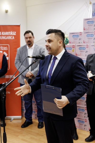 Hittner Krisztina a dm Kft. képviseletében szólt a jelenlévőkhöz. „Nagy öröm egy csecsemő érkezése a családba, de sok nehézséggel is jár, anyagi nehézségekkel is. 16 éve az a célunk, hogy ezt az időszakot könnyebbé tegyük. Országosan 260 üzletünkkel szimbolikus keresztszülőséget vállaltunk 260 családnál” – fogalmazott, és megköszönte az együttműködést a Karitásszal, hiszen így tudnak valóban eljutni azokhoz a kisgyermekes rászoruló családokhoz, akiknél a legjobb helyen vannak az általuk adományozott pelenkák.