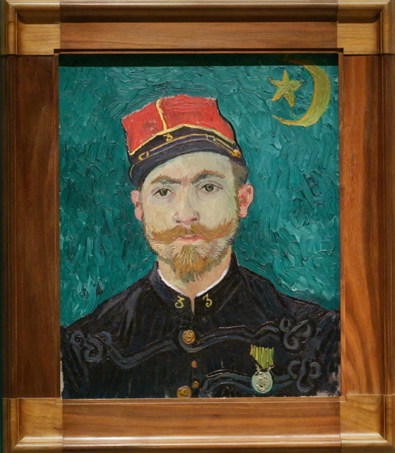 A teremben balra látható harmadik kép szintén egy portré, címe: A szerető (Milliet hadnagy arcképe). Van Gogh erről ezt írta öccsének: „Milliet portréján dolgozom, de nem jól ül modellt, bár ez talán az én hibám, mondjuk, nem hinném. Viszont nagyon kell róla vázlat, hiszen annyira jóképű, fiatalos és kellemes arcú, és éppen megfelelő lenne a szerelmespár egyik tagjához. Emellett alig van ideje, mivel el kell búcsúznia az érzékeny szívű szajháitól és a többi mocsárlakótól Arles posványában, mert a helyőrségen már pihenni fog (…), ahogyan ő mondja. Rendes fiú, de csupán huszonöt éves.” Ő volt tehát a zuáv Milliet hadnagy, akivel a festő Arles-ban találkozott, és akit még rajzolni is tanított. Az Észak-Afrikában szolgált hadnagy, amint a filmből megtudhatjuk, igen sikeres volt a nőknél; a jóképű, egyenruhás férfiból csak úgy áradt a magabiztosság. Ő lett a mester számára az ideális modell a szerető megformálásához. Van Gogh olyan párokat szeretett volna festeni, amelyek férfi tagjához Milliet adja a mintát. A portré színei is meghökkentők: erős türkiz háttér előtt láthatjuk a piros sapkás, vörös bajuszos férfit; remekül néz ki az egyszerű, faragatlan keretben. Kétségtelen, a színkörön egymás ellentétei a vörös és a zöld, a kék és a narancssárga, valamint a sárga és a lila. Ezek a színpárosítások együtt dinamikusabbak, mint más színkombinációkban. Érdemes megemlíteni a hadnagyhoz fűződő történetet is, mert különleges dolog, hogy egy „hétköznapi” ember, aki a festőnek modellje egykor volt, egyszerre híressé lett. Van Gogh leveleinek hála Milliet-nek nemcsak a neve és foglalkozása maradt fenn az utókor számára, hanem a hozzá fűződő történet is. No de lépjünk tovább!