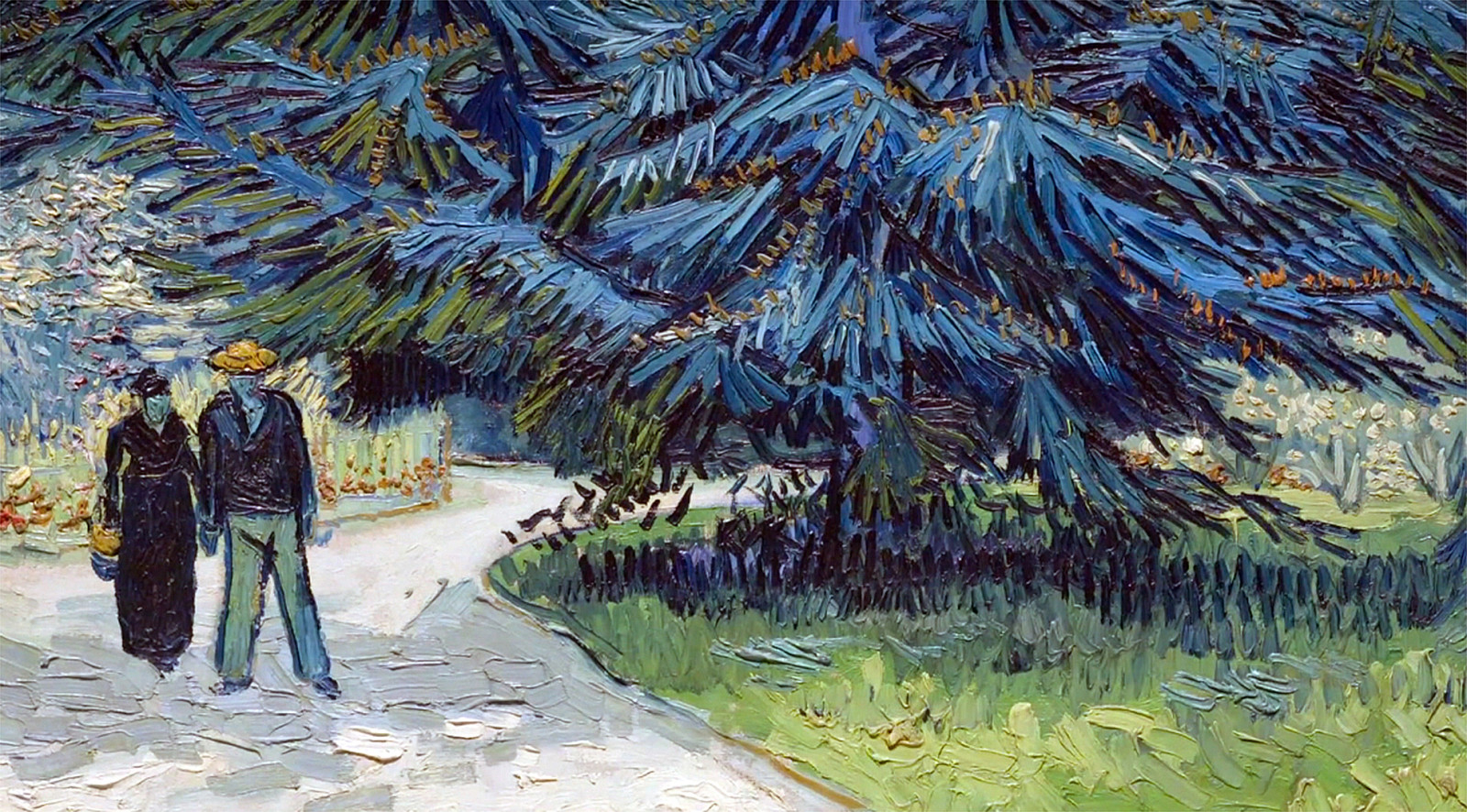 A londoni National Gallery kiállításán az első teremben a kurátorok mindössze három alkotást állítottak ki. Az egyik a Költők kertje címet viseli. Ez a hely nem messze volt attól a sárga háztól, amelyben Van Gogh négy helyiséget bérelt akkoriban. Hétköznapi kert volt, csak a festő képzelete tette költőivé. A képen egy nagy fa árnyékában fiatal pár sétál. A vászon felső részét szinte teljesen kitölti egy hatalmas, kékeszöld színű fenyő. Van Gogh – amint a filmben is látjuk – hihetetlenül vastag ecsetvonásokkal érzékelteti a fa erejét, nagyságát, méretes tűleveleit.