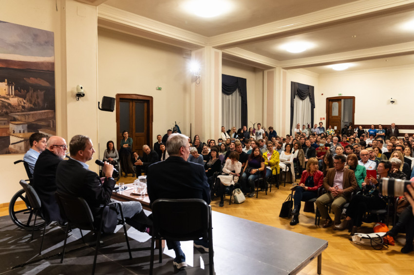 Karsai Dániel, Hofher József SJ, Orosz Gábor és Meskó Zsolt a Párbeszéd Házában
