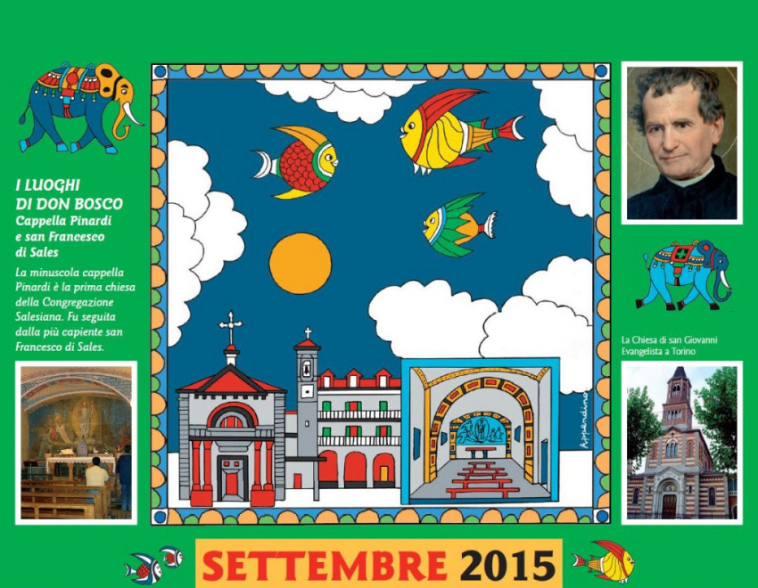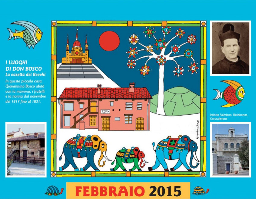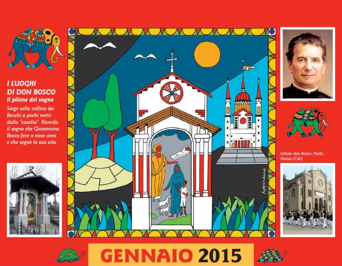 A naptárban Guido Appendino játékos, színpompás művei jelennek meg, mesebeli, égen úszó halakkal, teknősökkel, elefántokkal, virágba borult fákkal népesítve be a lapokat. Minden hónap mellett az ott látható, színes ruhába öltöztetett épülettel vagy emlékművel kapcsolatosan egy-egy „ajándék” gondolat olvasható, alul pedig Don Bosco egy-egy aktuális gondolata. A kiadványhoz ingyen hozzájuthatnak az olasz Bollettino Salesiano folyóirat megrendelői, de letölthető a lap internetes oldaláról is.