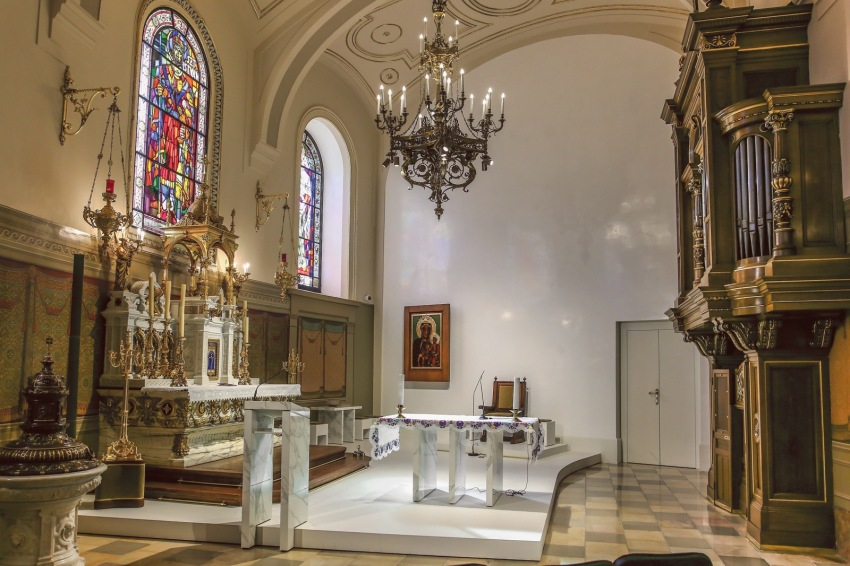 A félköríves szakrális tér barokkos, historikus oltára a fal vonalában helyezkedik el – nincs szemben a hívek padsorával, illetve az ideiglenesen kialakított széksorokkal. Ezért az oltárra merőlegesen elhelyeztek itt egy kredenciaasztalt a szembemisézéshez. A díszes ereklyetartóban lévő Szent Jobb már tavaly kikerült a kápolnából, és a Benczúr Gyula által festett hatalmas oltárkép előtt kapott helyet a bazilika főhajójának Nagyboldogasszony-oltáránál.