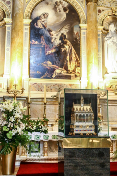 A bazilika terében az országfelajánlást ábrázoló Benczúr Gyula-kép előtt tavaly helyezték el a Szent Jobbot. Az oltár feletti tabernákulumot elvitték, mert a rajta álló bronzfeszület belelógott az oltárképbe. A félhomályos térben, a fekete hátterű ereklyetartóban a Szent Jobb nem nagyon látszik, igazán csak a teljes kivilágítás idején érvényesül a relikvia.