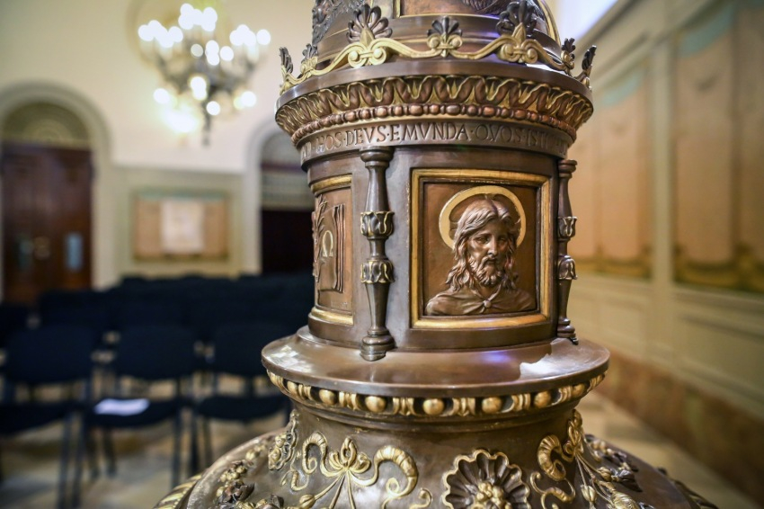 A Szent Jobb-kápolnából a sekrestyébe átlépve láthattuk, hogy a farestaurátorok szépen felújították a terem közepén álló, faragott oszlopokkal díszített, neoreneszánsz emeletes szekrényt. A farestaurátorok mellett, kő- és festő-restaurátorok, ötvösök is dolgoztak itt. A díszítő falfestés is a régi színeiben ragyog már – tudhattuk meg Galina Zoltán építésztől. Az üvegablakok színes üvegmozaikjai újkoriak, a bordűrök viszont még az eredetiek, Róth Miksa munkái. A kortárs megoldások a sekrestyében is találkoznak a historikus, századfordulós stílus emlékeivel. Mindenütt igyekeztek összehangolni a kettőt. Az újonnan kialakított beépített szekrényeket például a felújított neoreneszánsz nagyszekrényhez hasonló színűre pácolták.