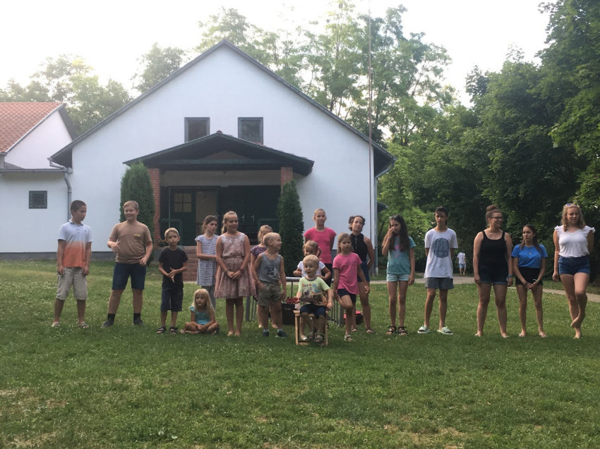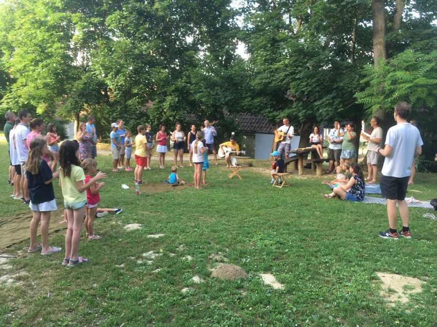 A közös dalok, táncok tanulása sem maradt el, amit be is mutattak a péntek esti tábortűznél, a szülők legnagyobb örömére. Két és fél éves kisfiunk is a gyerekközösség tagja (és gitárosa) lett, és kéthónapos kislányunk is szívesen töltött a gyerekvigyázóval is egy-egy órát.