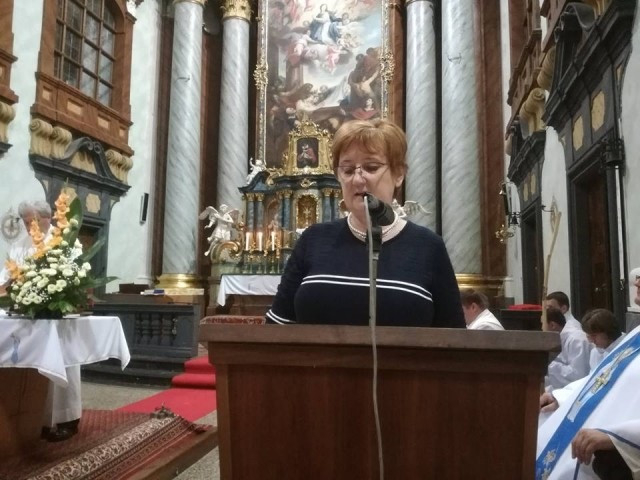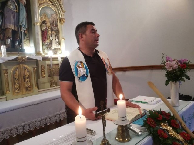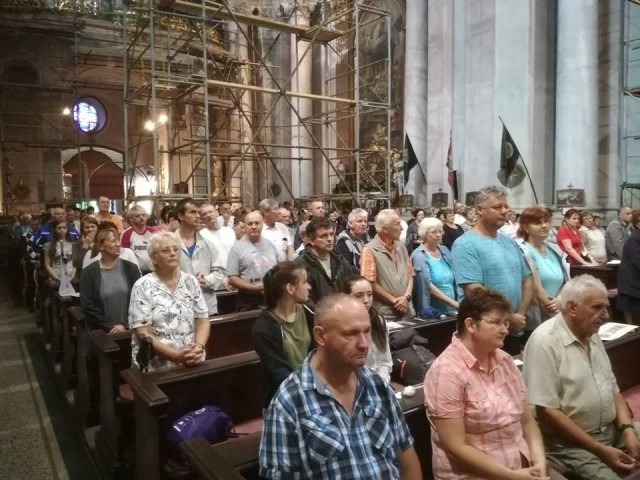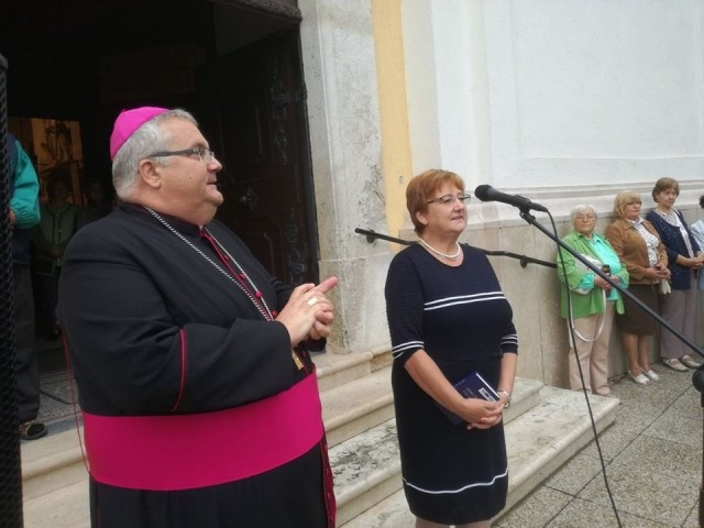 A szentgotthárdi Nagyboldogasszony-templom bejáratánál Peter Štumpf püspök és Kissné Köles Erika nemzetiségi szószóló köszöntötte a zarándokokat, akik a Halogyról indult szakaszt tették meg.