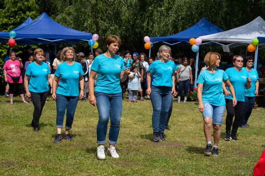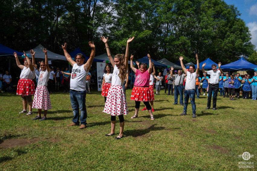 Az ellátottak tánca után a munkatársak is bemutattak egy táncos produkciót. Ráadásként bárki beállhatott közéjük, örömtáncuk végén kéz a kézben, kígyózó láncban járták be a tánctérré vált füves területet.