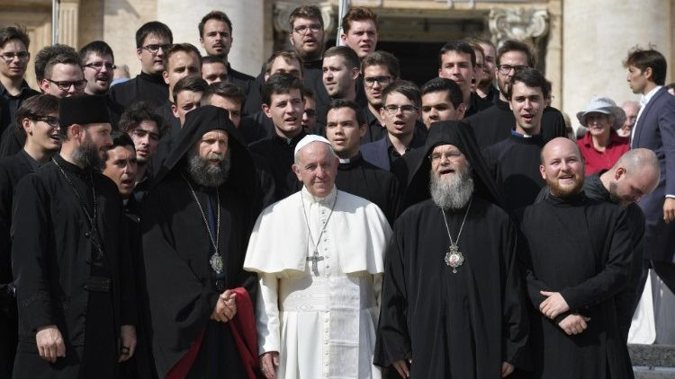 A zarándoklatnak igen fontos eleme volt a találkozás a Szentatyával. Az általános kihallgatáson negyven teológus vett részt, közülük többen Rómában tanulnak.