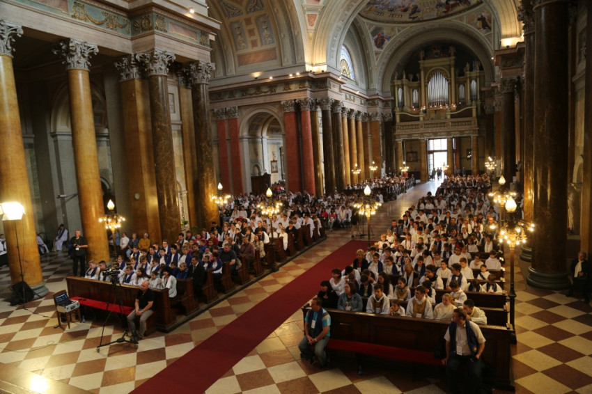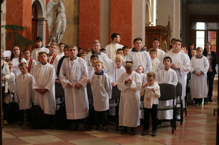 A gyülekező után most is a főutcán vonultak a bazilikába a résztvevők a találkozó nyitó szentmiséjére. A főcelebráns Bábel Balázs érsek szentbeszédében először a talákozó mottójául szolgáló mondat kapcsán a miniszter–minisztráns szó eredetéről beszélt.