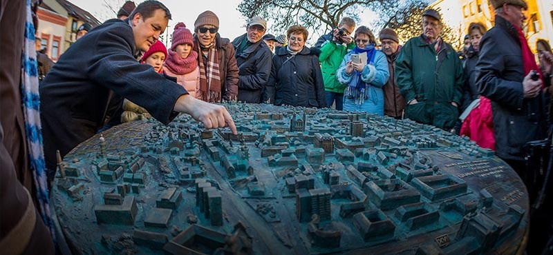 A két méter átmérőjű makettet egy 60 centiméter magas gránit oszlop tartja, és kicsit a város jövőjébe is betekintést ad, hiszen a Haladás Sportkomplexum is felkerült rá.