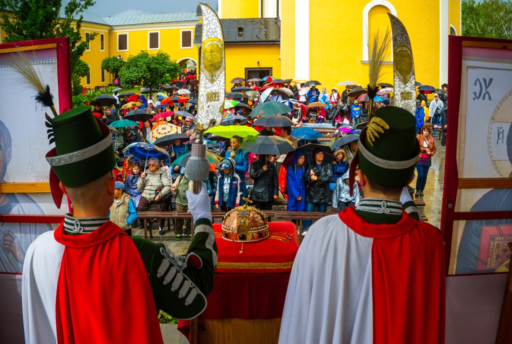 A Szent Liturgia előtt a koronaőrök az ikonosztáz előtt ünnepélyesen elhelyezték a Szent Koronát, melyet a szertartás végén körmenet keretében a Szűzanya kegyképe elé vittek át, ahol az érdeklődők vasárnap délig tekinthették meg.