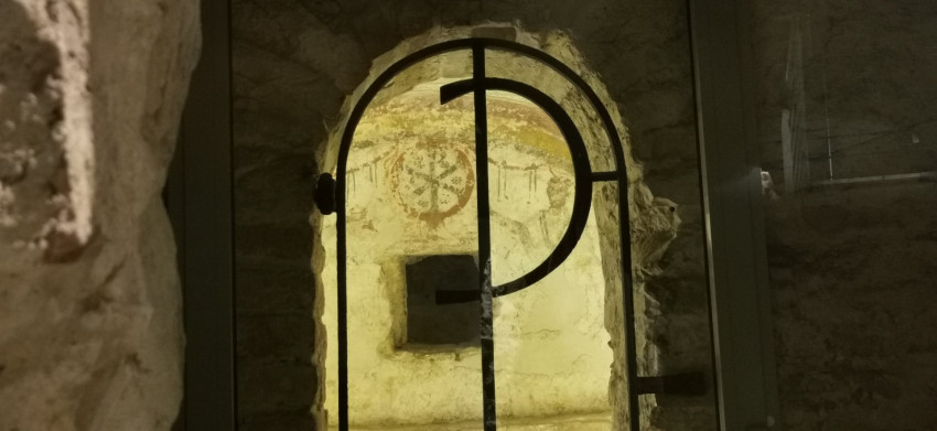 Az igazi időutazás azonban az ókeresztény temetőkápolna és sírkamrák régészeti bemutatója volt a belváros alatt. A hely az UNESCO-világörökség része. A termek falfestése a római katakombákéhoz hasonlít. Különösen fontos volt számunkra az a sírkamra, amelynek falán a Krisztus-monogram is látható: kezdettől ez a szimbólum jelzi a társaság tagjainak összetartozását.