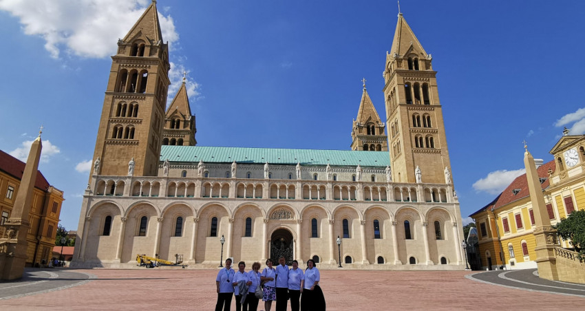 Onnan a pécsi bazilikába, vagyis a pompás Szent Péter és Szent Pál-székesegyházba mentünk, örömmel láttuk restaurálását, megújulását; majd a püspöki palotát jártuk be. Itt az egyházmegye püspökeinek élete, munkássága tárult elénk. Különösen Virágh Ferenc életére voltunk kíváncsiak: az ő püspöksége idején alakult ugyanis a közösségünk.