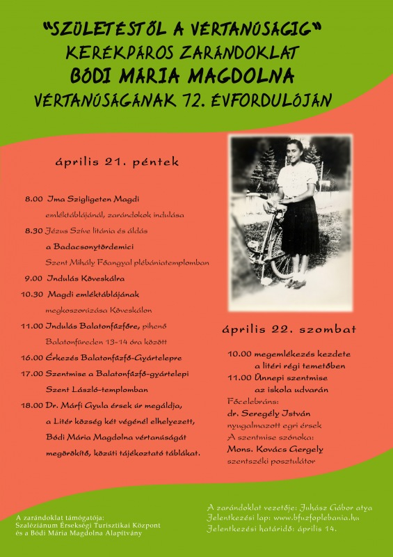 18.00 Márfi Gyula érsek megáldja a Litér község két végénél elhelyezett, Bódi Mária Magdolna vértanúságának emléket állító közúti tájékoztató táblákat.