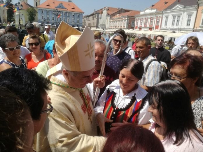 A püspökszentelésre a temesvári Szent György-székesegyházban került sor, melynek alapkőletétele szintén augusztus hatodikán volt. Itthon ez a dátum a Kis-Somlyó-hegyén álló Salvator-kápolna búcsúnapja, az Úr színeváltozásának ünnepe. Az ünnepi szertartás tíz órakor kezdődött a lehető legnagyobb pompával, méltóságteljesen. Jelen volt Románia pápai nunciusa, a legfőbb egyházi méltóságok, a történelmi Magyarország felekezeteinek, valamint a mai Magyarország kormányának képviselete, az egyházi rendek, mozgalmak, civil elöljáróságok küldöttsége, több mint háromszáz papi személy különféle felekezetből, a resicabányai hívek.