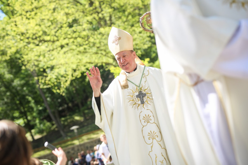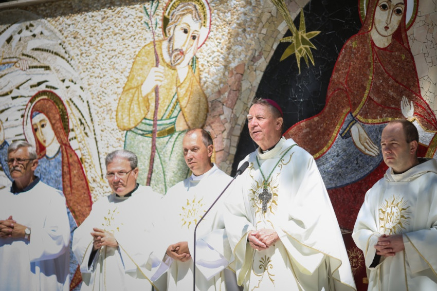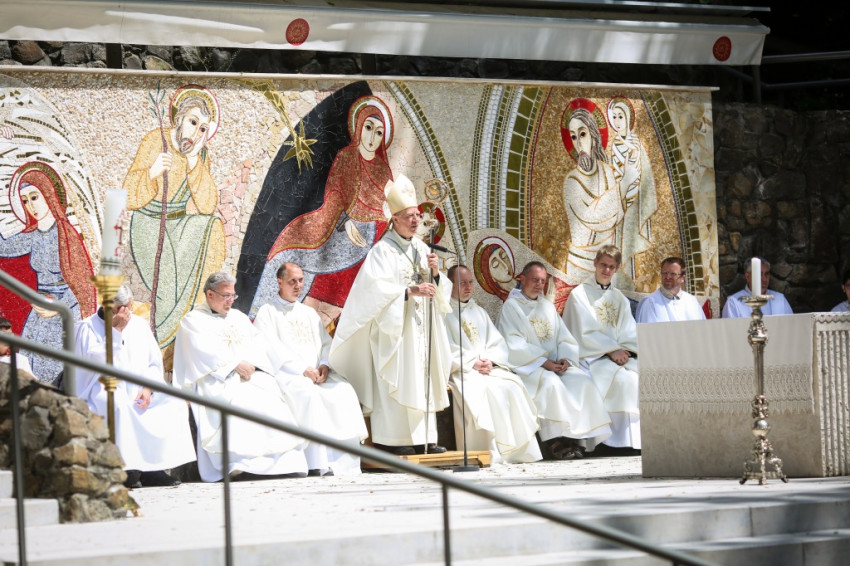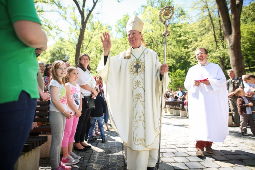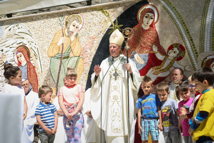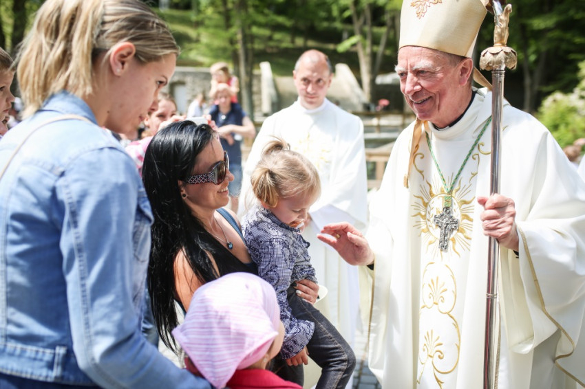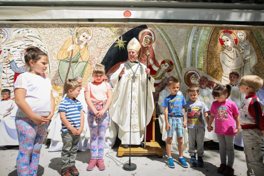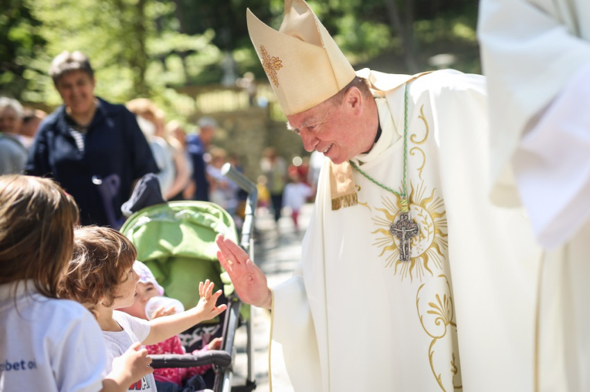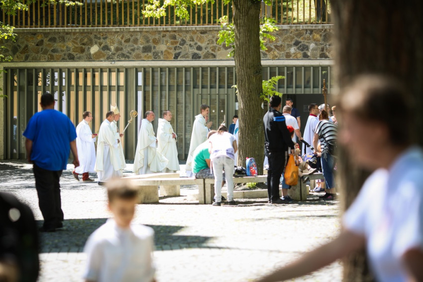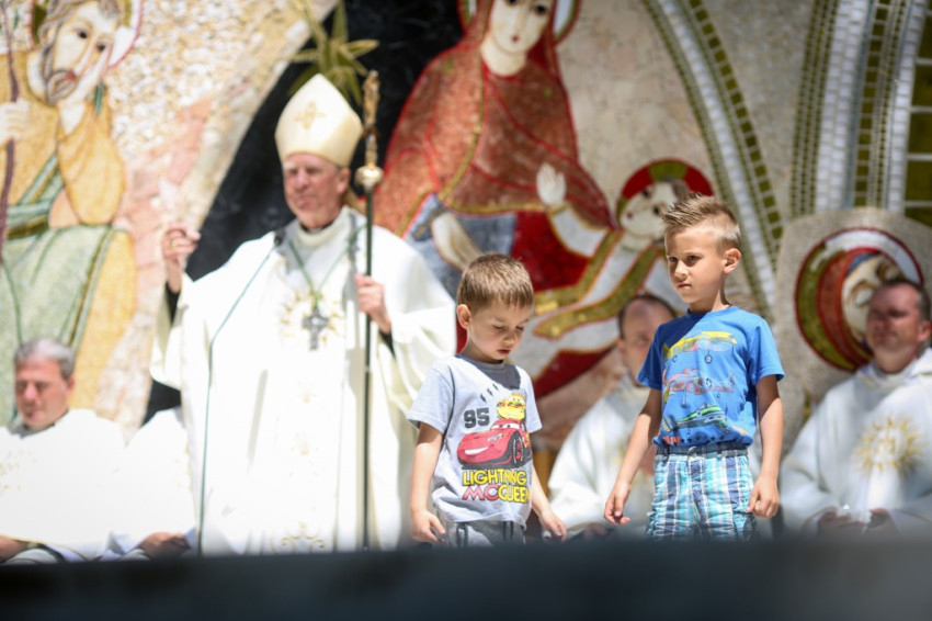 Harangoznak, kezdődik a mise, érkezik a püspök. Feltűnő, hogy mennyire lassan ér az oltárhoz, és ennek a gyerekközpontúsága az oka: újra meg újra megáll, lehajol a legkisebbekhez, keresztet rajzol a homlokukra, megszólítja őket, láthatóan szívesen időzik köztük. A misét sem a hagyományos módon, szertartásosan kezdi, hanem egy kis „előhanggal”: a kegyhely igazgatójával váltott néhány szóval a mai alkalom különlegességéről, a Váci Egyházmegye és Szűz Mária gyermekeinek nevezve a kicsiket.