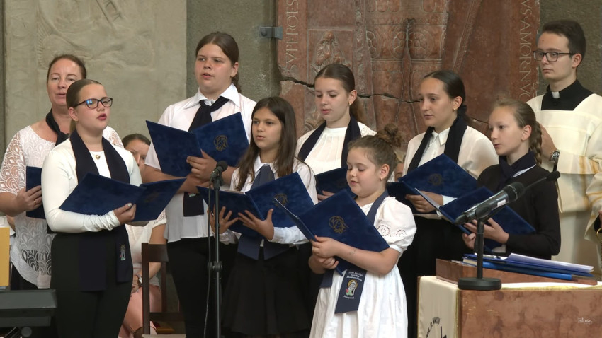 A helyi katolikus iskola diákjai énekekkel köszöntötték a főpásztort.