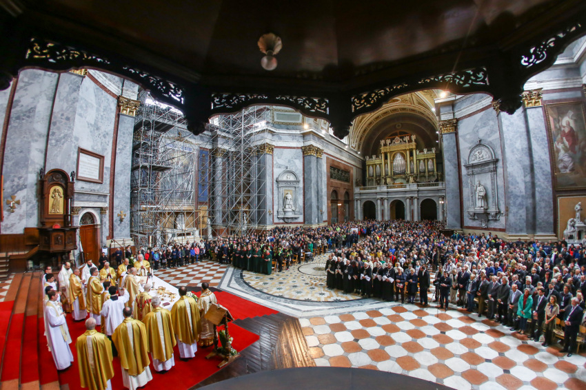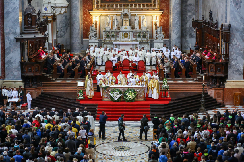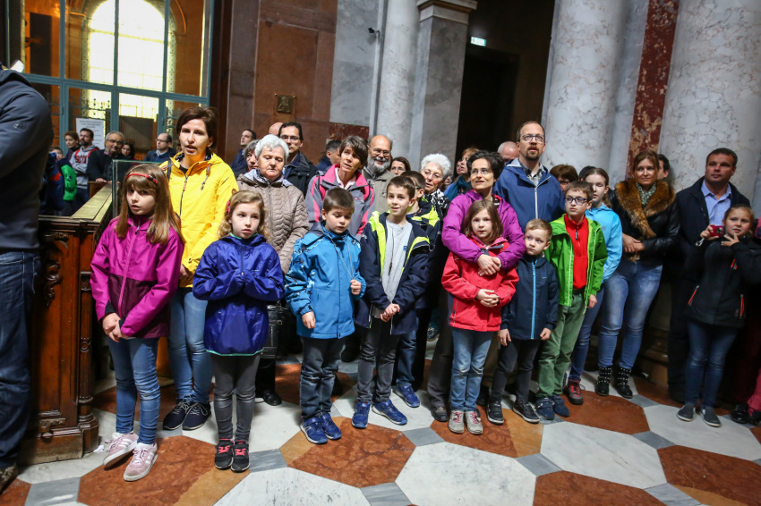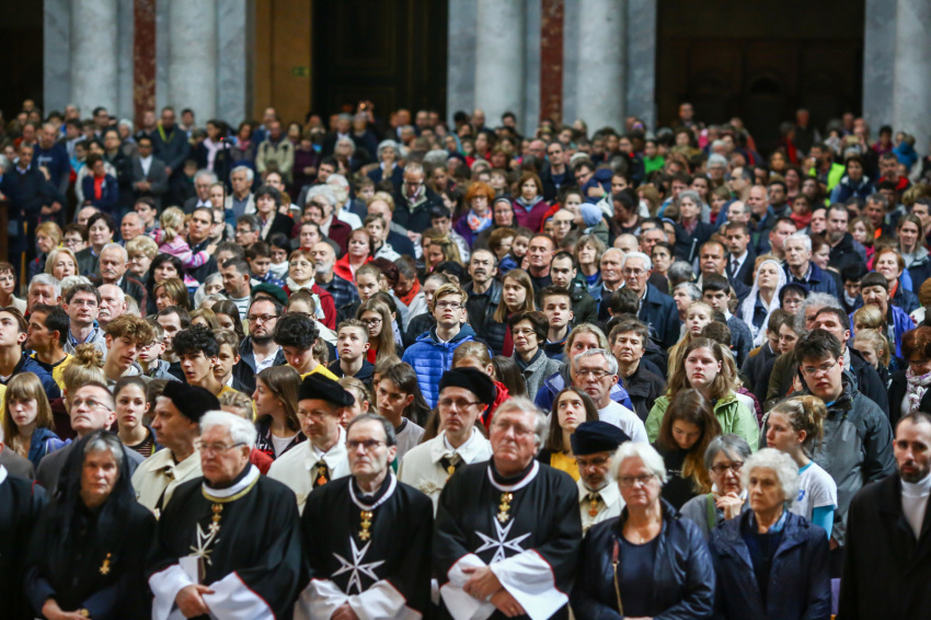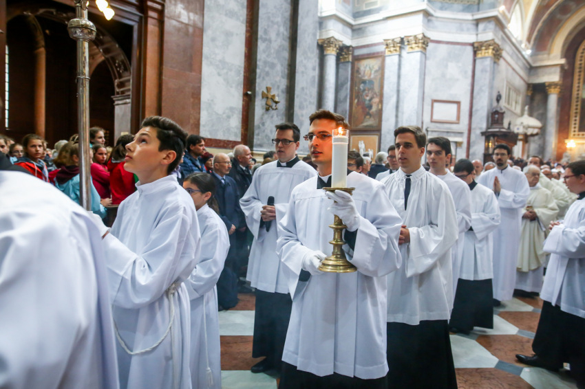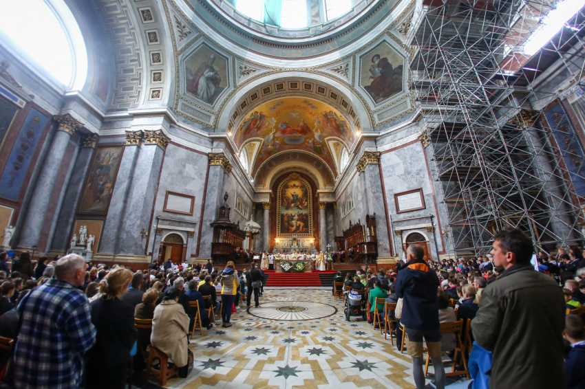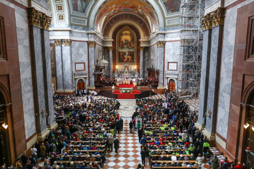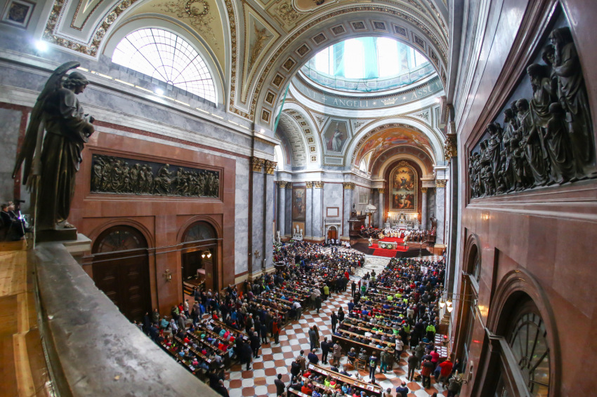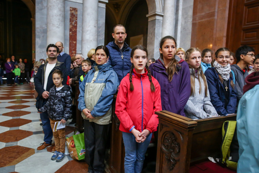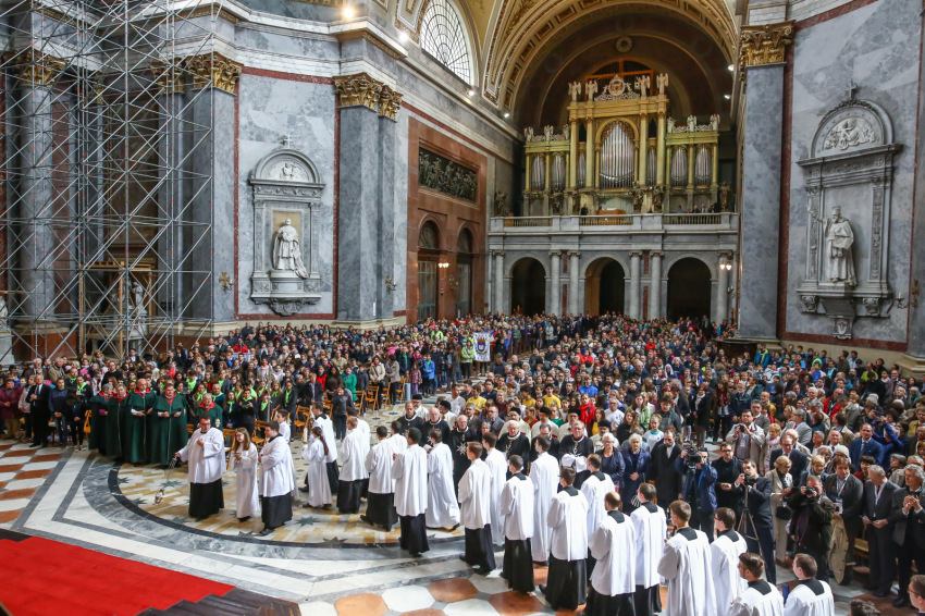 Megtelik a bazilika. Itt vannak az esztergomi Vitéz János Katolikus Nyelvoktató Német Nemzetiségi Általános Iskola, a szintén esztergomi Mindszenty József Katolikus Általános Iskola, a budapesti Szent II. János Pál Iskolaközpont, valamint a Reménység Katolikus Általános Iskola diákjai és tanárai, a fővárosi Liliomkert Katolikus Óvoda közössége, valamint a vác-alsóvárosi plébánia Kolping-családja.