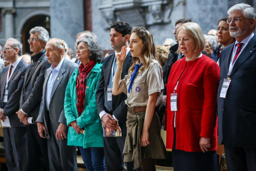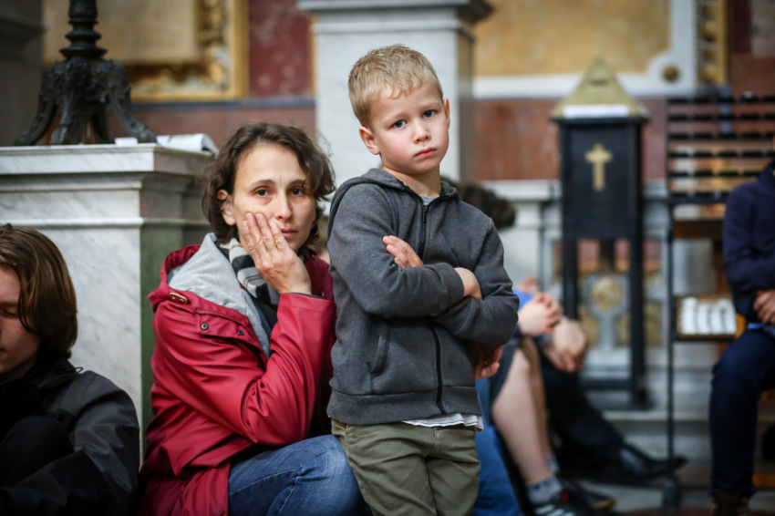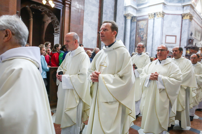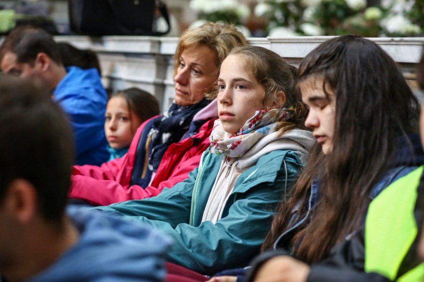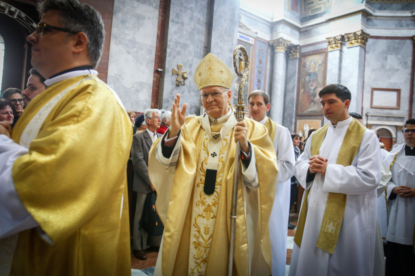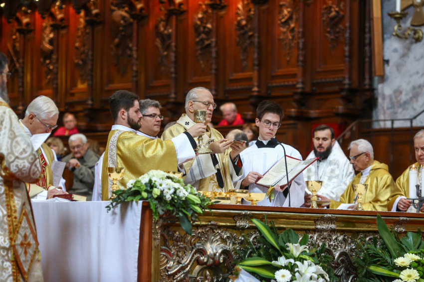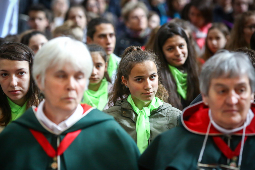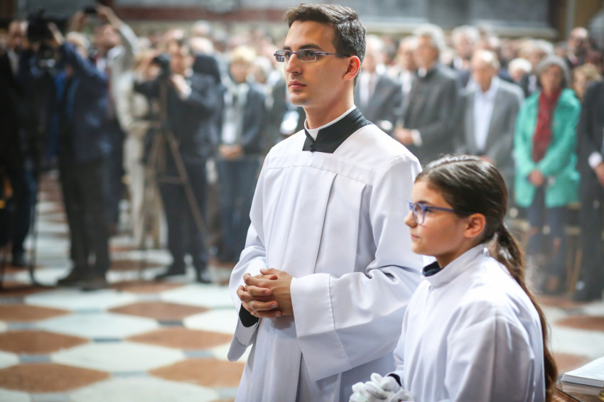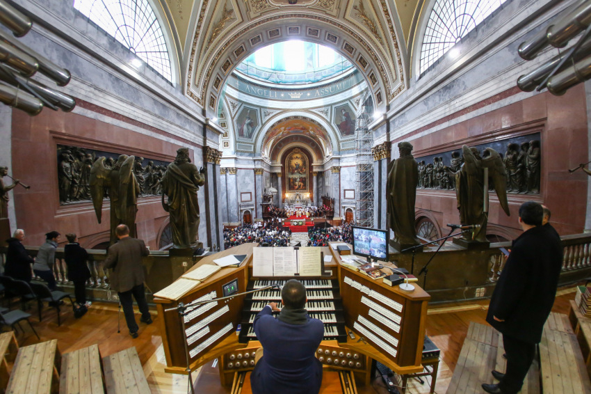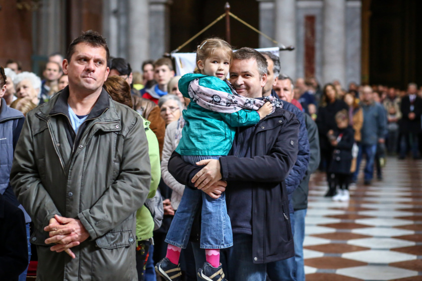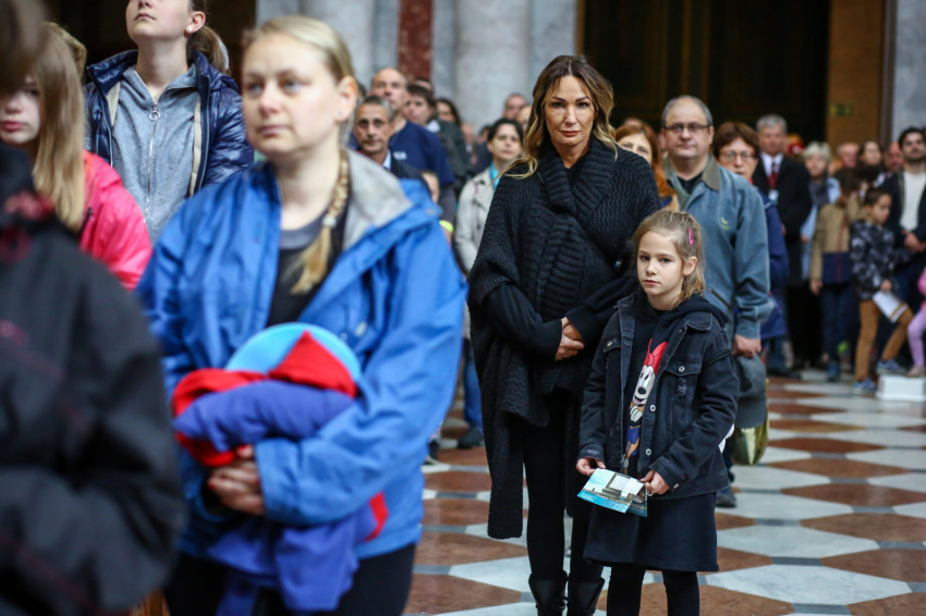 Megtelik a bazilika. Itt vannak az esztergomi Vitéz János Katolikus Nyelvoktató Német Nemzetiségi Általános Iskola, a szintén esztergomi Mindszenty József Katolikus Általános Iskola, a budapesti Szent II. János Pál Iskolaközpont, valamint a Reménység Katolikus Általános Iskola diákjai és tanárai, a fővárosi Liliomkert Katolikus Óvoda közössége, valamint a vác-alsóvárosi plébánia Kolping-családja.