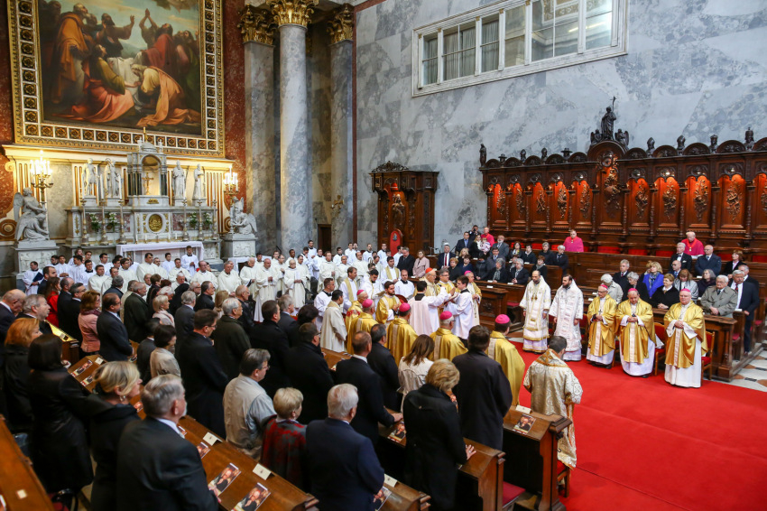 Az ünneplőket a szentmise főcelebránsa, Erdő Péter bíboros, prímás köszöntötte. Kifejezte örömét, hogy a Magyarország Barátai Alapítvány tagjai Vizi E. Szilveszter elnök vezetésével szintén jelen vannak a szentmisén. „Kis nyelv a magyar. Azt is szokták mondani, hogy nehéz nyelv. Igen fontos, hogy legyenek megbecsült emberek szerte a világon, akik ismerik és átérzik népünk sorsát és valódi helyzetét, és tudásukat, meggyőződésüket meg tudják osztani környezetükkel is. Ennek a fajta tanúságtételnek is különleges példája volt Mindszenty József, akinek neve ma is ismert szerte a világon” – fogalmazott Erdő Péter. A bíboros köszöntötte a Lengyelországból érkezett zarándokokat is, akik Szent Kinga ereklyéjét hozták el Esztergomba, valamint a dévai Szent Ferenc Alapítvány jelen lévő munkatársait és növendékeit.