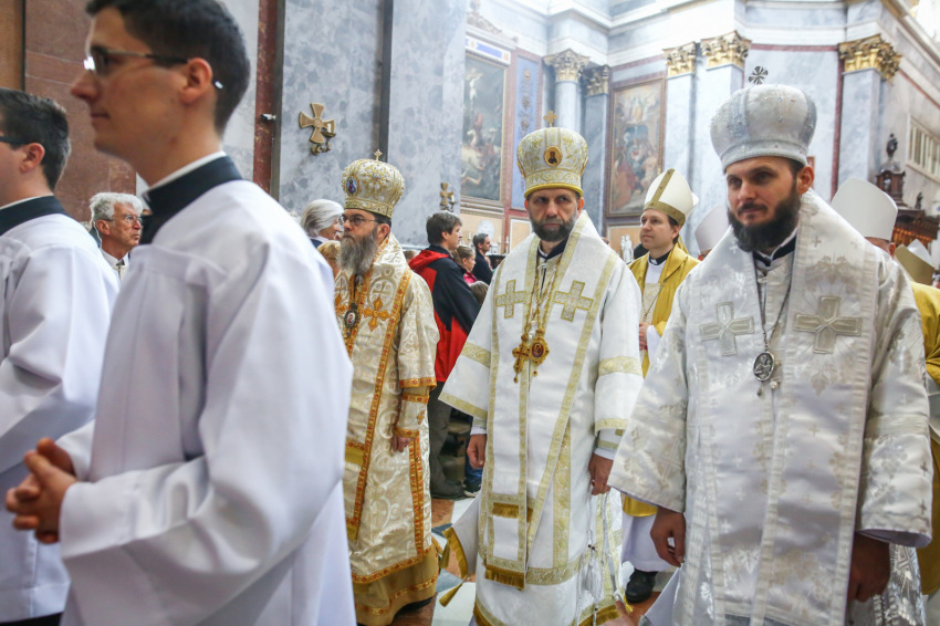 A főcelebráns mellett az oltár körül püspöktársak koncelebráltak, a szentmise szónoka, Böcskei László nagyváradi püspök, Michael August Blume apostoli nuncius, Ternyák Csaba egri érsek, Bábel Balázs kalocsa-kecskeméti érsek, Udvardy György, Spányi Antal, Palánki Ferenc megyéspüspökök, Gyulay Endre nyugalmazott megyéspüspök, Cserháti Ferenc és Mohos Gábor segédpüspökök, valamint Kocsis Fülöp görögkatolikus érsek-metropolita, Orosz Atanáz és Szocska Ábel görögkatolikus püspökök.