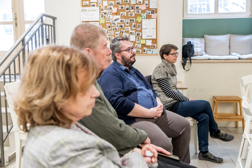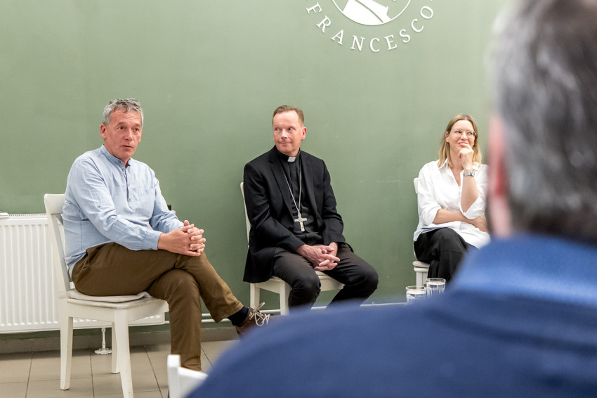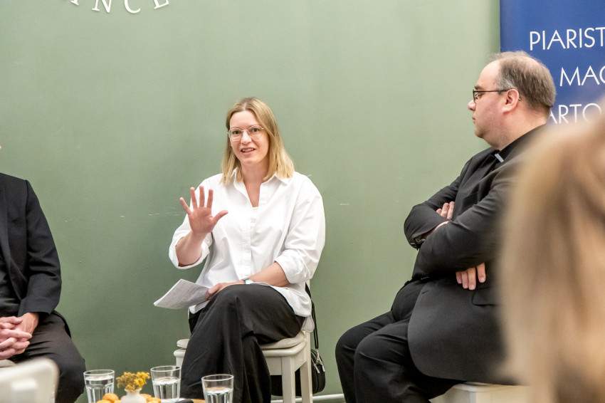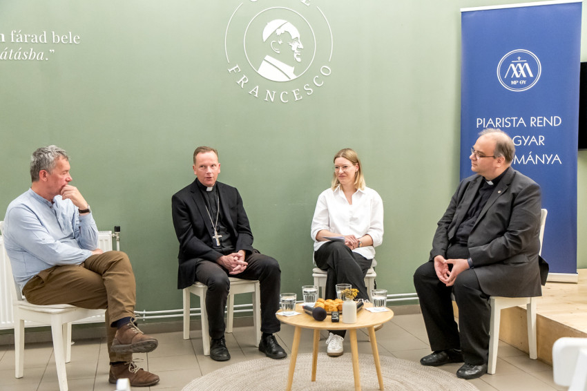 A budapesti missziós kávézóban tartott kerekasztal-beszélgetés résztvevői – Zsódi Viktor SchP piarista tartományfőnök; Fábry Kornél esztergom-budapesti segédpüspök; Koncz András, a kötet egyik szerkesztője és Kalmár Petra hitoktató, a Piarista Rend Magyar Tartományának szervezetfejlesztő munkatársa – az iskolai lelkigyakorlatok kihívásait járták körül.