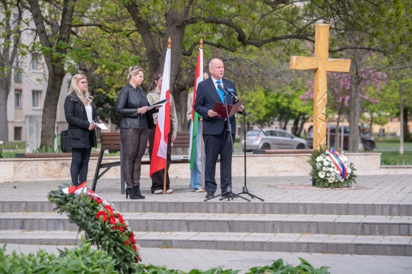 A magyar és a lengyel himnusz elhangzása után Szalai Tamás, a nemzetiségi önkormányzat elnöke mondott beszédet. „A rendszerváltás óta eltelt nagyjából 35 év alatt a bukott kommunista rendszer egyik, ha nem a legnagyobb a »szekrényből kieső csontváza« Katyń. Ma már nyíltan, félelem nélkül tudunk beszélni a világ ezen részén az 1940-ben történt, emberi aggyal fel nem fogható tisztogatásról, tömeggyilkosság-sorozatról” – fogalmazott, majd felelevenítette a háborús bűncselekmény történetét. Hozzátette, az országban több helyen kopjafák, emléktáblák, tölgyfaleveleket, monumentális erdőket megformáló alkotások őrzik Katyń és Szmolenszk emlékét, de csak néhány helyen áll kereszt. Szalai Tamás köszönetét fejezte ki Székesfehérvár városvezetésének az emlékkereszt felállításáért és közvetlen környezetének gondozásáért.
