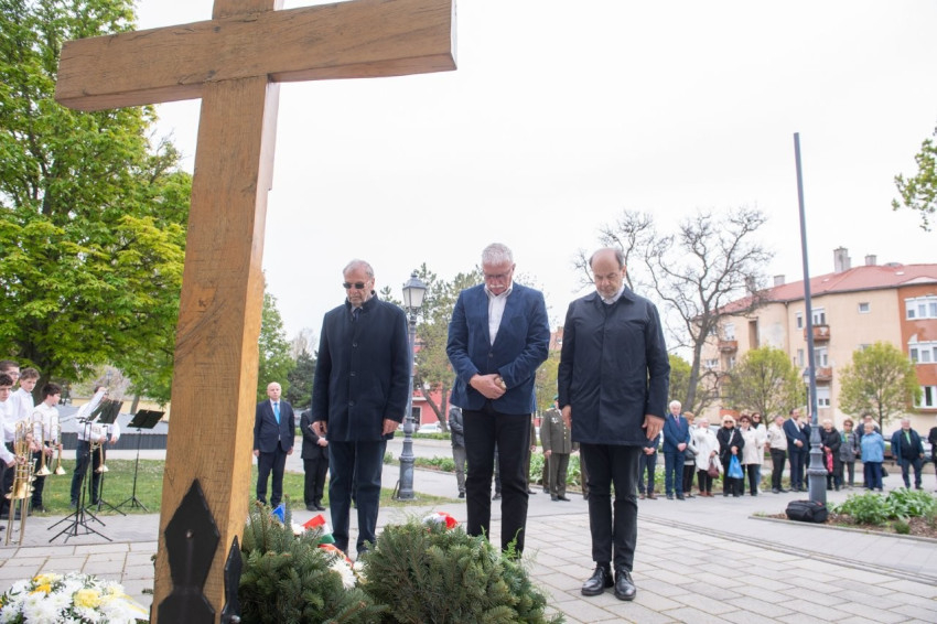 A keresztnél Lehrner Zsolt és Horváth Miklós Csaba, Székesfehérvár alpolgármesterei és Szabó Tibor, a Fejér megyei közgyűlés alelnöke helyeztek el egy-egy szál virágot.