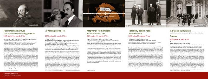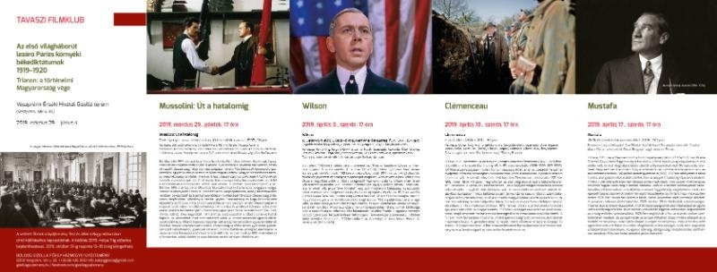 A filmklub kitekintést ad az I. világháború és a békeszerződések korának meghatározó nemzetközi politikai szereplőiről, kiemelkedő vezető személyiségeiről. A nyolcrészes centenáriumi vetítéssorozat első alkalmain az európai és az amerikai győztes nagyhatalmak meghatározó szereplőinek életútjával, politikai törekvéseivel, a háborút lezáró békék feszültségével ismerkedhetünk meg, majd májustól a háborút követő magyarországi eseményekre, Tisza István miniszterelnök 1919-es meggyilkolásának történetére, a Trianonban elszakított országrészeken élő magyarság küzdelmeire, a két világháború közötti korszak politikájára és kiemelten a trianoni konferenciára fókuszál a sorozat. A történelmi filmklub helyszíne a veszprémi érsekség Gizella terme, ahol minden alkalommal 17 órakor kezdődnek a vetítések.