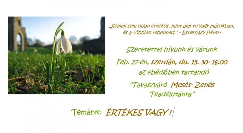 A délután kezdetén a dolgozók és a betegek közreműködésével előadták Max Lucado Értékes vagy című meséjét. A zene, a tea és a sütemények, a teaházi hangulat segítették az oldódást, a betegek sokat beszélgettek, nevettek. Olyan is volt, aki elsírta magát, s olyan is, aki őszintén elmondta, hogy ilyen szép, terített asztalos élménye még életében nem volt.