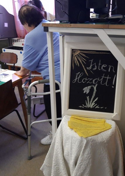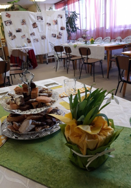 Szabóné Szekeres Ildikó és Bálint Brigitta lelkigondozók célja az volt, hogy teaházas-cukrászdás hangulatot varázsoljanak a betegeknek az ebédlőbe, ahol mindenki kizökkenhet egy kicsit a kórházi bezártságból és megérezheti a tavasz közelségét.