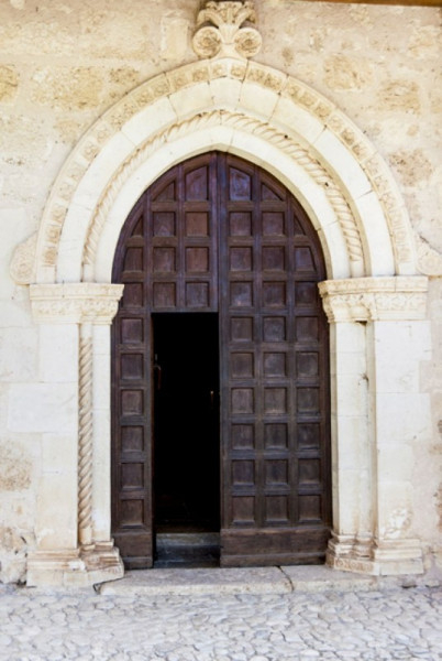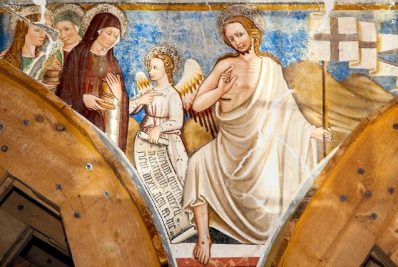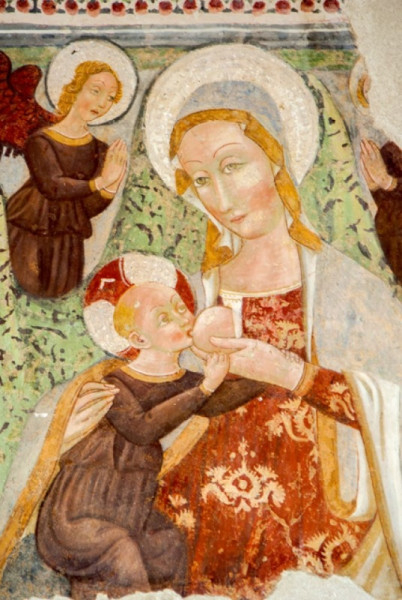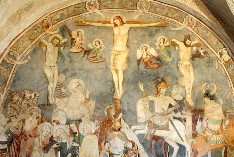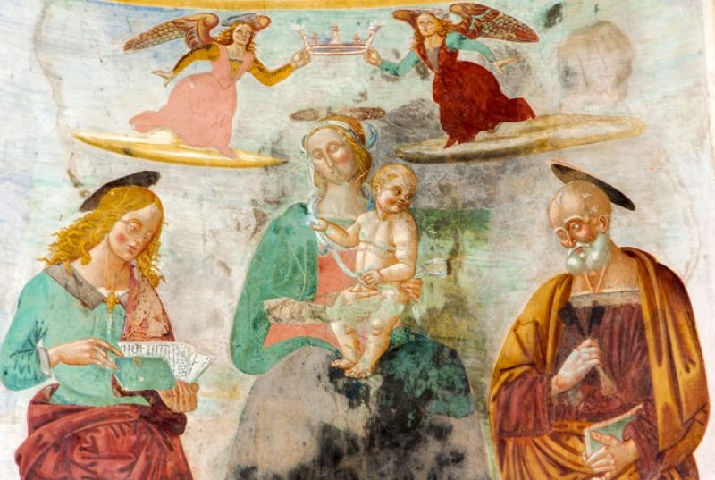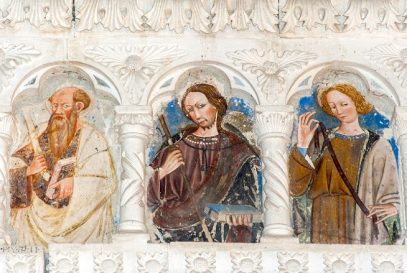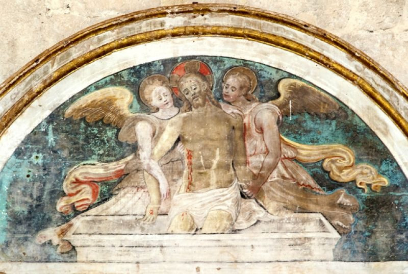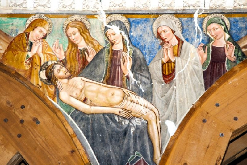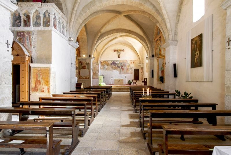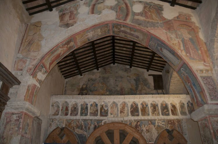 A templom belső terét Nicola da Siena, Domenico da Leonessa, valamint Giovanni és fia, Antonio Sparapane freskói díszítették. A falképek a 15. században készültek. Freskókkal borított boltív keretezte az ikonosztázt, amely a karzat mellvédjét ékesítette. Kőlépcső vezetett fel a loggiára, megközelíthetővé téve a falra függesztett, fából készített, csodatévőnek tartott feszületet. A kereszt háttereként szolgáló freskón a Szűzanya és Szent János voltak láthatók angyalok egy csoportjával, akik Krisztus vérét kelyhekben gyűjtötték össze, a szenvedő Megváltóval vállalt compassio (’együtt szenvedés’) jeleként megszaggatva ruhájukat.