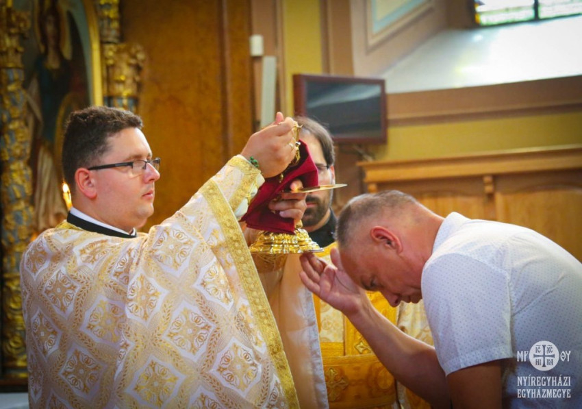 A Szent Liturgián szolgálatának első állomásaként áldoztathatott a fiatal lelkipásztor. A hála szavai után Aranyics Arnold újszentelt pap áldást adott az ünneplő közösségre, és mirovált (olajjal megkente a hívők homlokát).