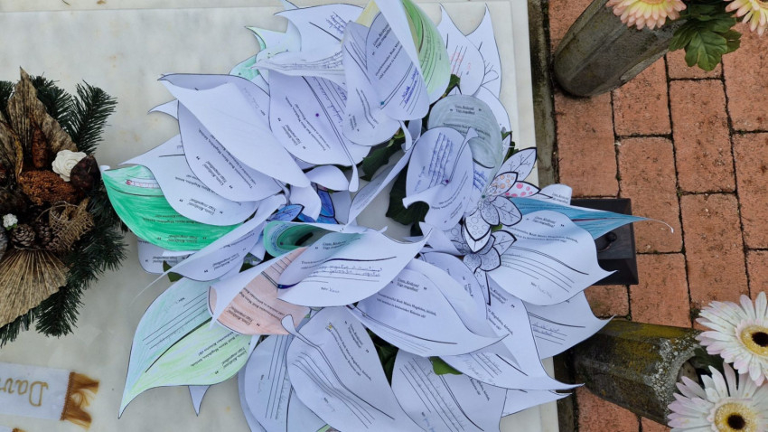 A hittanos találkozó megható pillanata volt, amikor a gyermekek egy koszorúra helyezték Bódi Mária Magdolnának írt kéréseiket, imáikat, gondolataikat, melyet a találkozó végén Laposa Norbert balatonfűzfői plébános a temetőben, Magdi sírján elhelyezett.