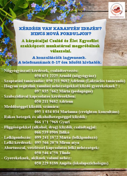 A kárpátaljai Család és Élet Egyesülete szakképzett munkatársai várják továbbá a meddőségben érintettek, alkoholizmussal, daganatos betegséggel küzdők valamint függőségekkel élők családtagjainak hívását, kérdéseit.