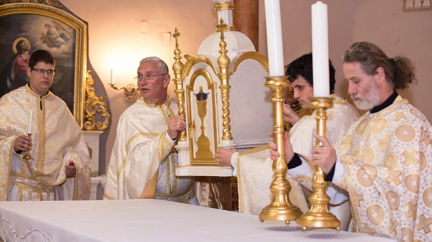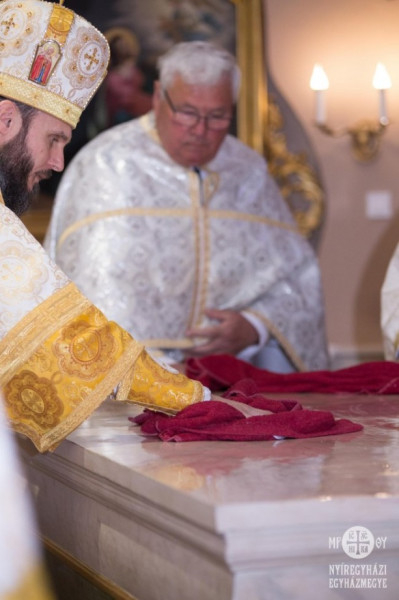 A munkálatok záróakkordját jelentő szertartást Szocska A. Ábel nyíregyházi megyéspüspök vezette, aki az oltárban Boldog Gojdics Pál ereklyéjét helyezte el és pecsételte le müróval (megszentelt olajjal) és viasszal. A püspök és a papok az oltárt szenteltvízzel és illatos szappannal, majd – Krisztus áldozatára emlékezve – rózsavíz és vörösbor keverékével mosták le. Az áldozati aszalt és a templom falait szentelt olajjal kente meg a főpásztor, s végül tömjénezés és szenteltvízzel való meghintés által vált teljessé a szentelés, mely után Szent Liturgiát mutattak be. A püspök mellett Kocsis Antal parókus kilenc paptestvérével állta körül a legszentebb áldozat asztalát.