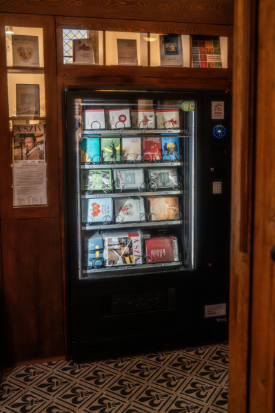 Egy zsebkönyv-automatákat gyártó olasz céget azzal kerestek meg, hogy készítsen el a Jezsuita Kiadó egyedi igényei szerint egy olyan gépet, amely több száz oldalas könyvek és nagyalakú magazinok kiadására is alkalmas. Három hónapos levélváltás, több hét tesztelés és öt nap utazás után érkezett meg az elegáns, fekete szerkezet Milánóból, amely a templomi könyvesbolt régi bejáratánál kapott helyet. A különlegesen csendes, a kiadványokat lifttel leszállító automatából a Jezsuita Kiadó tizenöt legnépszerűbb könyve, valamint aktuális folyóiratai vásárolhatók meg, kizárólag bankkártyával.