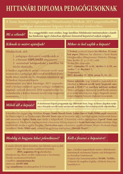A levelező képzés két félévben, tizenkét szombati napon (félévente hat alkalom) a Szent Atanáz Görögkatolikus Hittudományi Főiskolán (Nyíregyháza, Bethlen Gábor utca 13–19.) folyik.