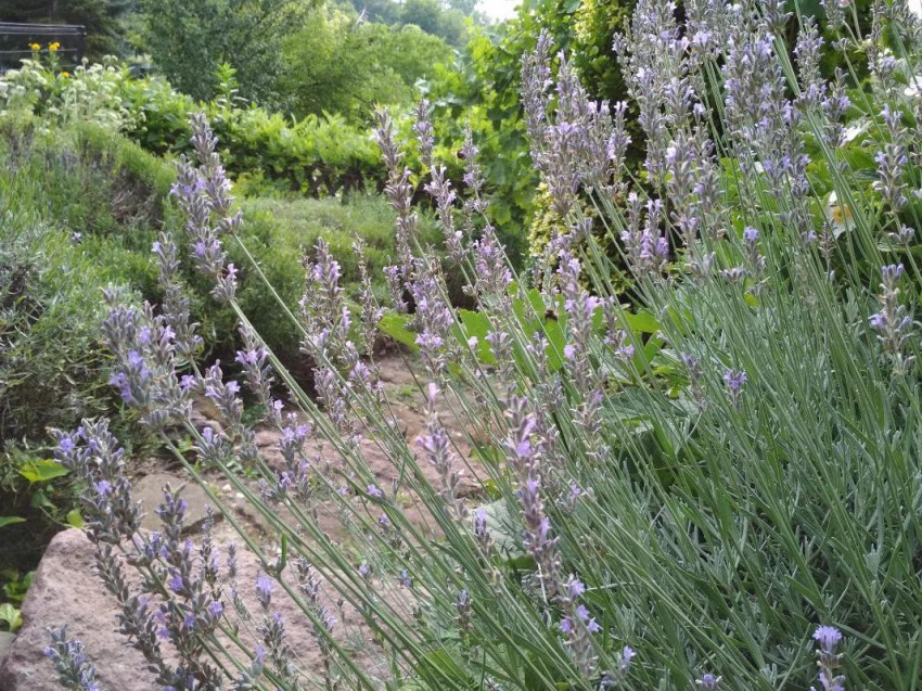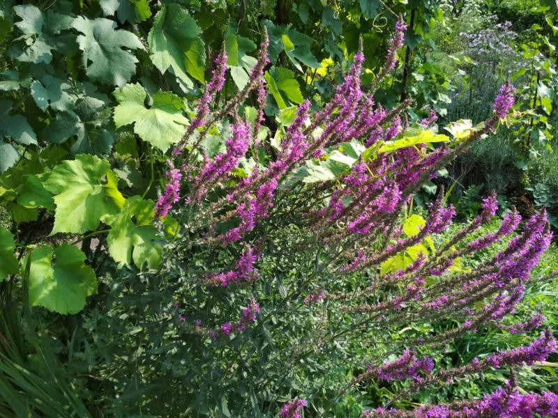 A levendulák, a hegyi csombor, a réti füzény hajtásai, úgy tűnik, a fény után törekedve próbáltak még májusban kijutni a szőlőlugas árnyékából, azért dőltek meg ennyire, de a virágfüzér vége már újra megpróbálja a függőleges irányt felvenni.