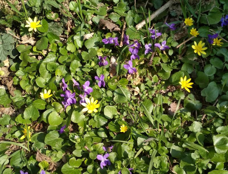 A kökörcsinek, héricsek kezdik el már márciusban ezzel a két színnel csalogatni, táplálni a korán ébredő poszméheket, dongókat, aztán jönnek egymás után az aranyságra pimpók, mézillatú ternyék, nyurga kutyatejek, köztük a sötétkék gyöngyikék, és még a bokrok alatti nyirkosabb, árnyékosabb részekre is jutnak virágok, hiszen az utolsó ibolyák között ilyenkor már feltűnnek a salátaboglárkák ragyogó sárga csillagai is.
