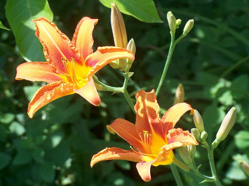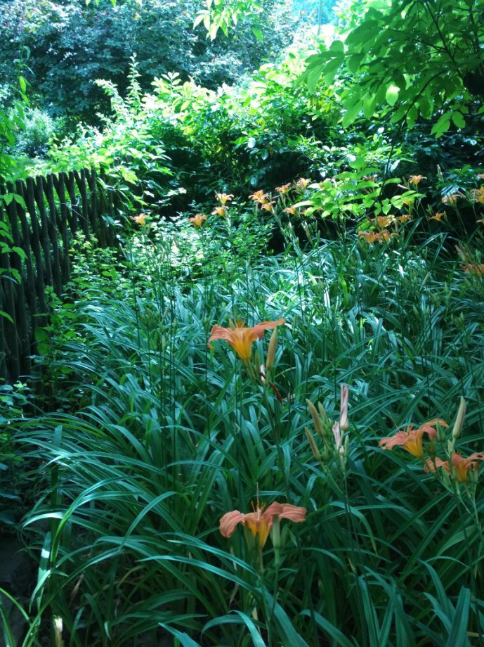 A téglavörös virágú, igénytelen, sarjakkal is terjedő régi fajtát már évek óta hagyjuk a diófa alatt terjedni. Lassan már nincs is más növény itt, hiszen mély az árnyék, és a lehullott diófalombot is kevés növény viseli el téli takaróként. De a sásliliom virul, öntözés nélkül is, nyáron néhány hétig még a virágaival is kedveskedik, aztán augusztusra elfekszik, szalmasárgára fakul a lombja, végül le lehet gereblyézni, csak a csupasz, mélyen repedezett talaj marad, de ez éppen jó, hiszen Kisasszony napján elkezd potyogni a dió, könnyű így megtalálni őket. Mire vége a diószüretnek, újra kihajt, és zöldell egész ősszel.