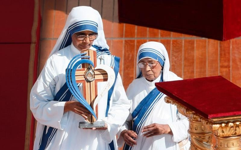 Teréz anya kereszt alakú ereklyetartójának eleje különböző faanyagokból készült, amelyek mind olyan helyről származnak, amelyhez a szent irgalmas cselekedetei kötődnek: a haldoklók számára létrehozott otthon Kalkuttában; a Hansen-betegségben (lepra) szenvedők otthona; egy migráns csónakja; egy egykor romák lakta kunyhó darabja. Ezeken kívül pedig egy gyóntatófülke térdeplőjének darabja is van benne, mert Teréz anya azt tartotta, ez a szentség fejezi ki legjobban Isten irgalmát – ismertette Kolodiejchuk atya.