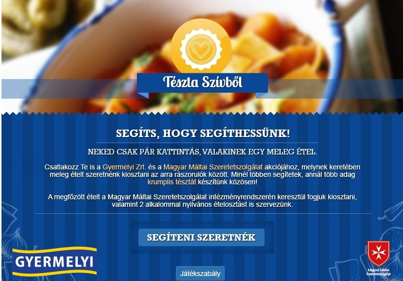 A mostani akcióban bárki részese lehet egy jótékonysági programnak, melynek keretében meleg étel kerül a rászorulók asztalára. A Gyermelyi márka Facebook-oldalán futó alkalmazásban, csupán néhány kattintással, minden felhasználó készíthet egy adag virtuális krumplis tésztát. Az oldalra ellátogatóknak nincs más dolguk, mint az összetevők hozzáadásával „megfőzni” az ételt.