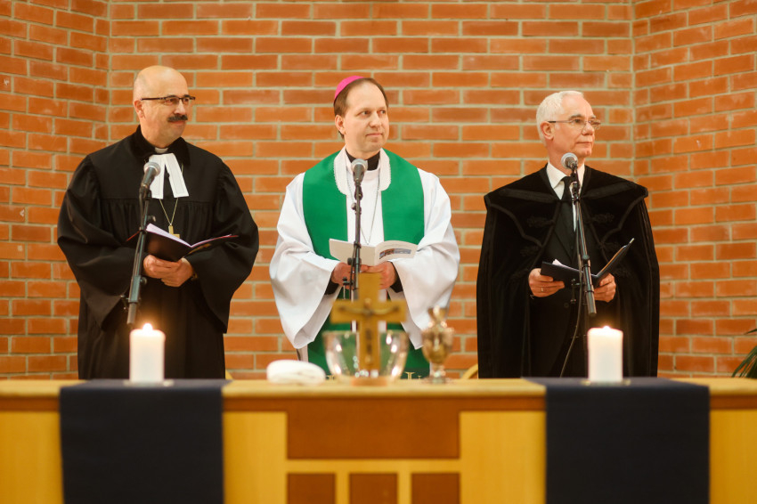 Az imát három püspök vezeti. Balog Zoltán református, Kondor Péter evangélikus és Mohos Gábor katolikus püspök egymás mellett áll az oltártérben.